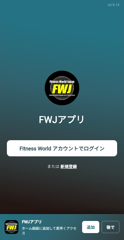 アカウント作成後、FWJアプリの起動画面から、FITNESS WORLDに登録したメールアドレスで認証を受けてログインしてください。